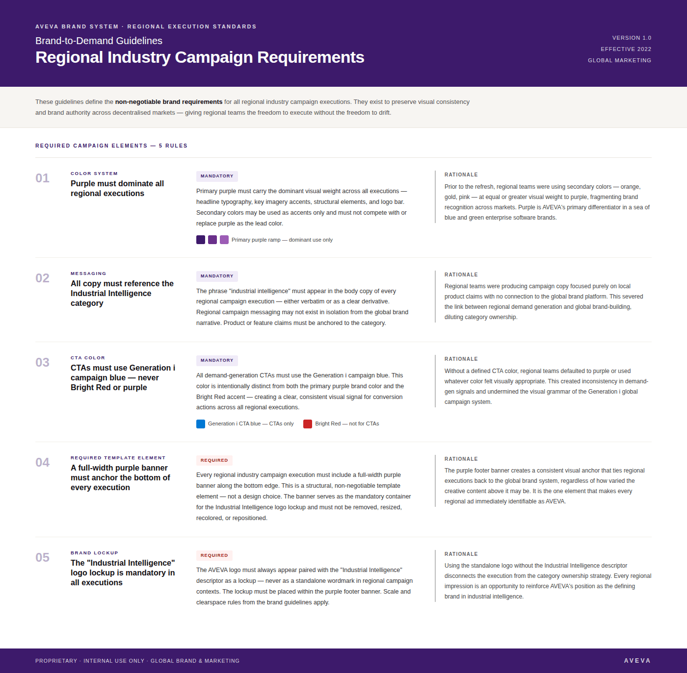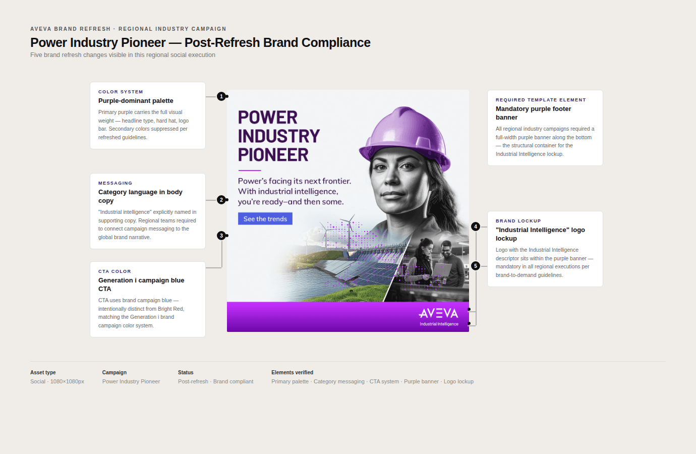 I led a targeted refresh across two interconnected layers: brand positioning and visual system. On the positioning side, we refined the brand platform — sharpening the purpose, promise, principles, and values to more precisely reflect AVEVA’s market position and strategic direction. This wasn’t a repositioning from scratch. It was the kind of precise, deliberate refinement that gives a brand team something they can actually build from. On the visual system side, the refresh addressed the specific areas where drift had occurred. Primary color usage was more clearly defined — explicit rules on application, proportion, and context. The secondary palette was replaced with a more toned-down, muted set of colors, with equally explicit guidelines on when and how they could be used. The looser, anything-goes approach that had enabled the drift was replaced with a system that made the right choice the obvious choice. Critically, we also developed brand-to-demand guidelines — a framework defining how the AVEVA brand should be represented in regional campaign work. Rather than leaving regional teams to interpret the brand system independently, the guidelines established clear rules: how the logo and tagline should appear in demand generation contexts, and where the line sits between brand expression and campaign flexibility. It gave regional teams the freedom to execute without the freedom to drift.